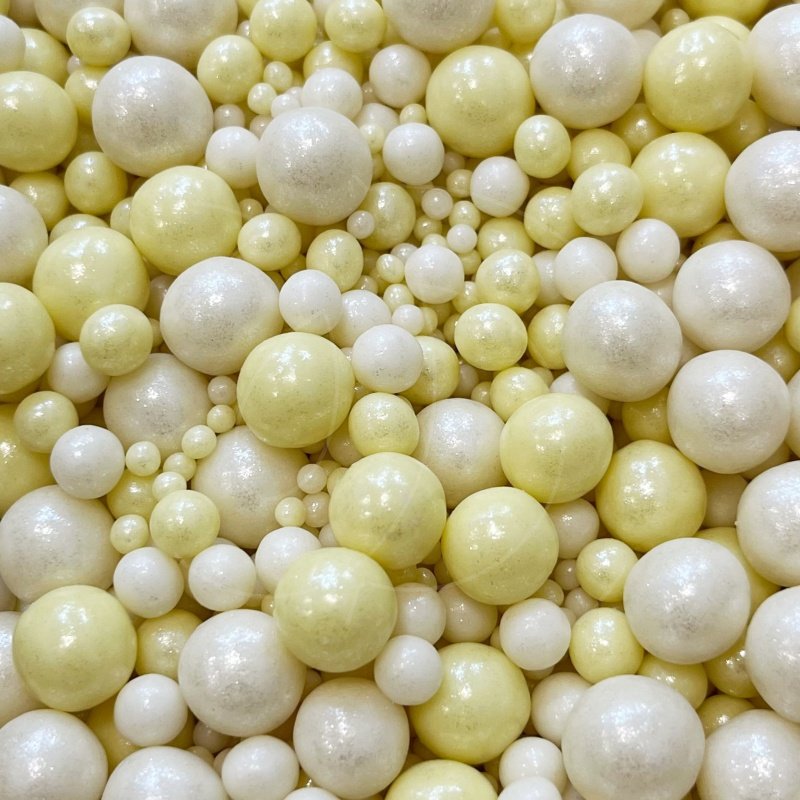 Жемчужная посыпка покрыта ярким пищевым блеском серебряного и желтого цвета.